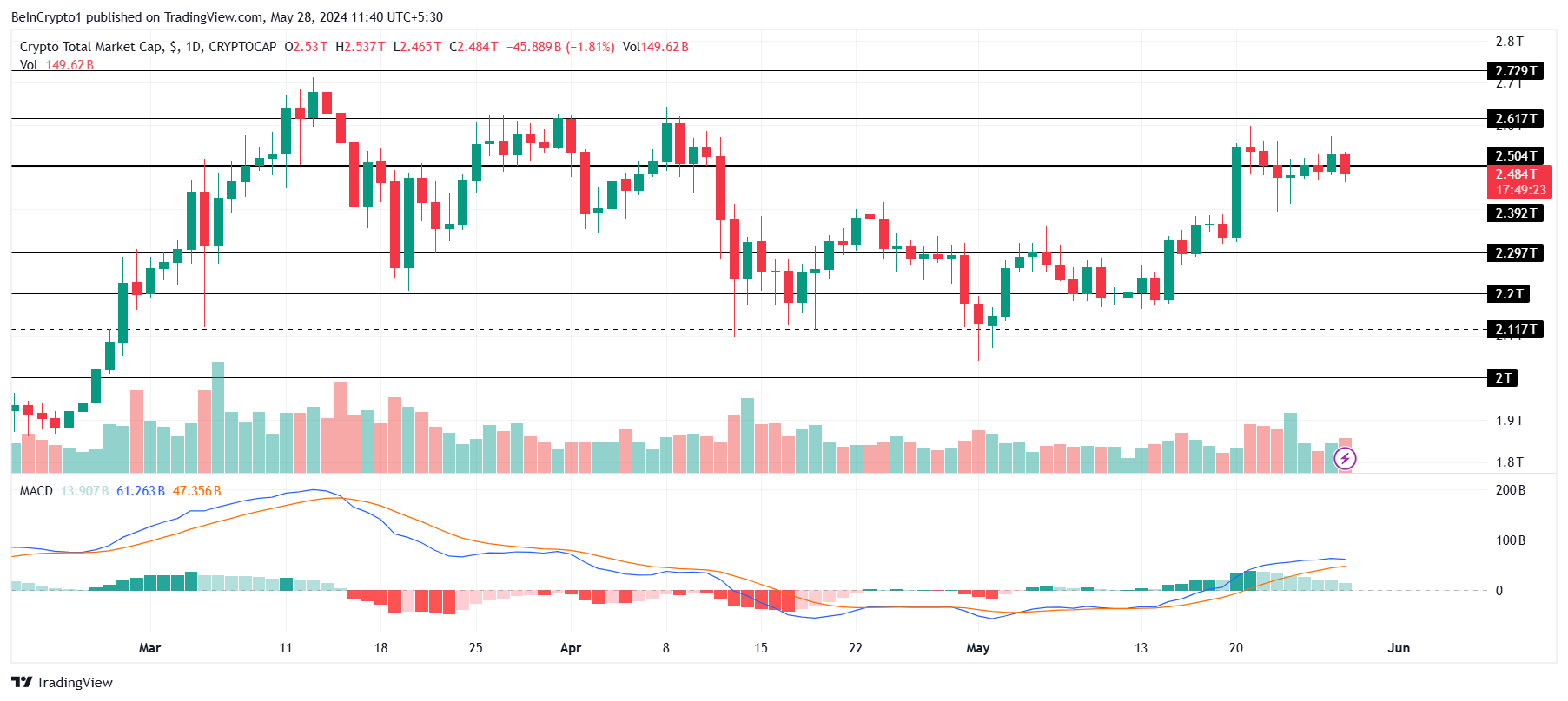 この下落強気が強まれば、暗号資産の評価額がさらに下落する可能性がある。これは2兆4000億ドルのTOTALを送る可能性がある。