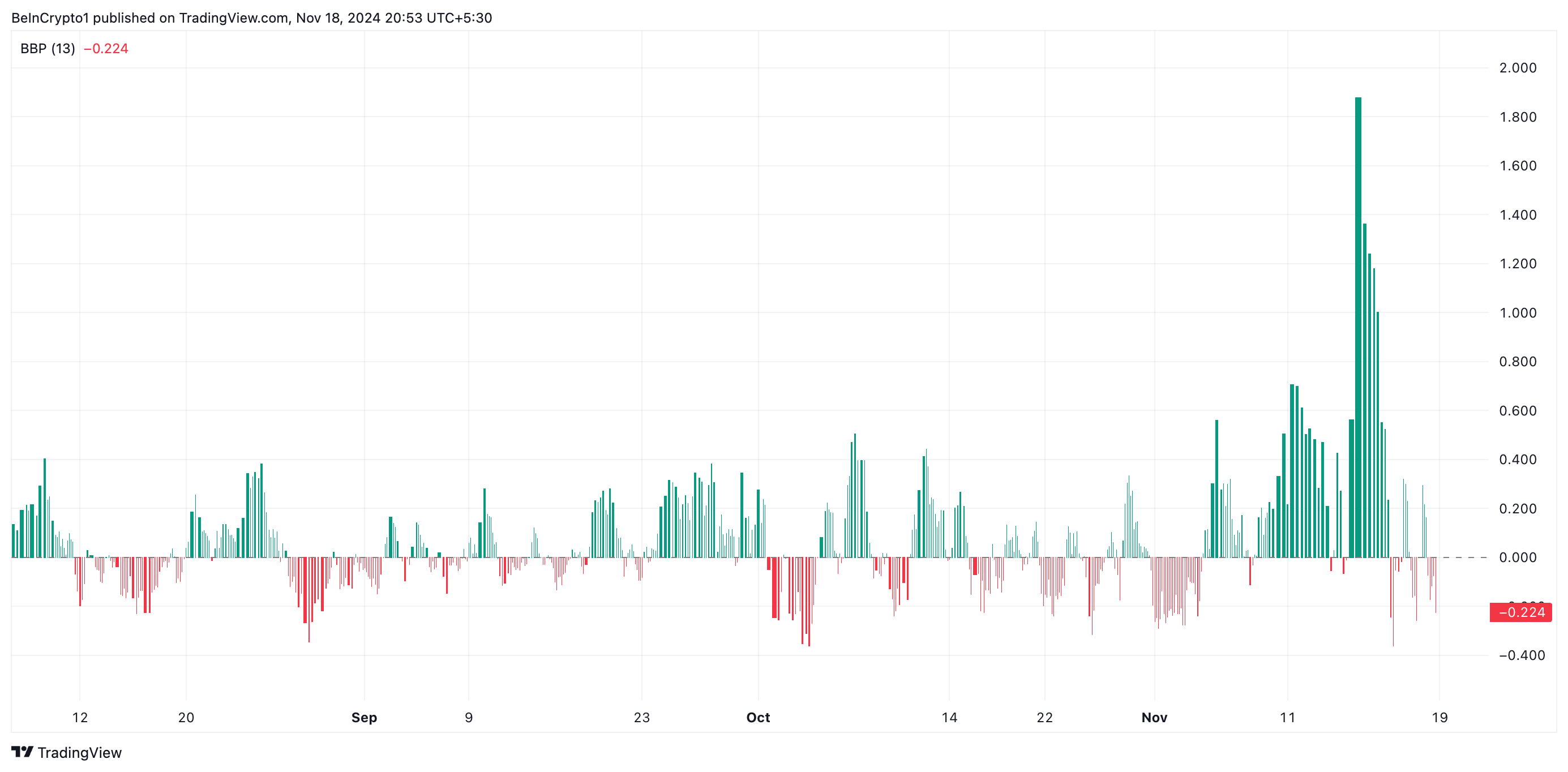 Elder-Ray Indexは市場の強気圧力と弱気圧力の強さを評価する。ゼロ以下に落ちると、弱気の力が強気の力を上回ったことを示し、弱気の勢いを意味する。これは、売り手が市場を支配し、価格を下げていることを示唆している。このような状況では、トレーダーは負の値を今後の下降トレンドや売り圧力の警告として解釈する。