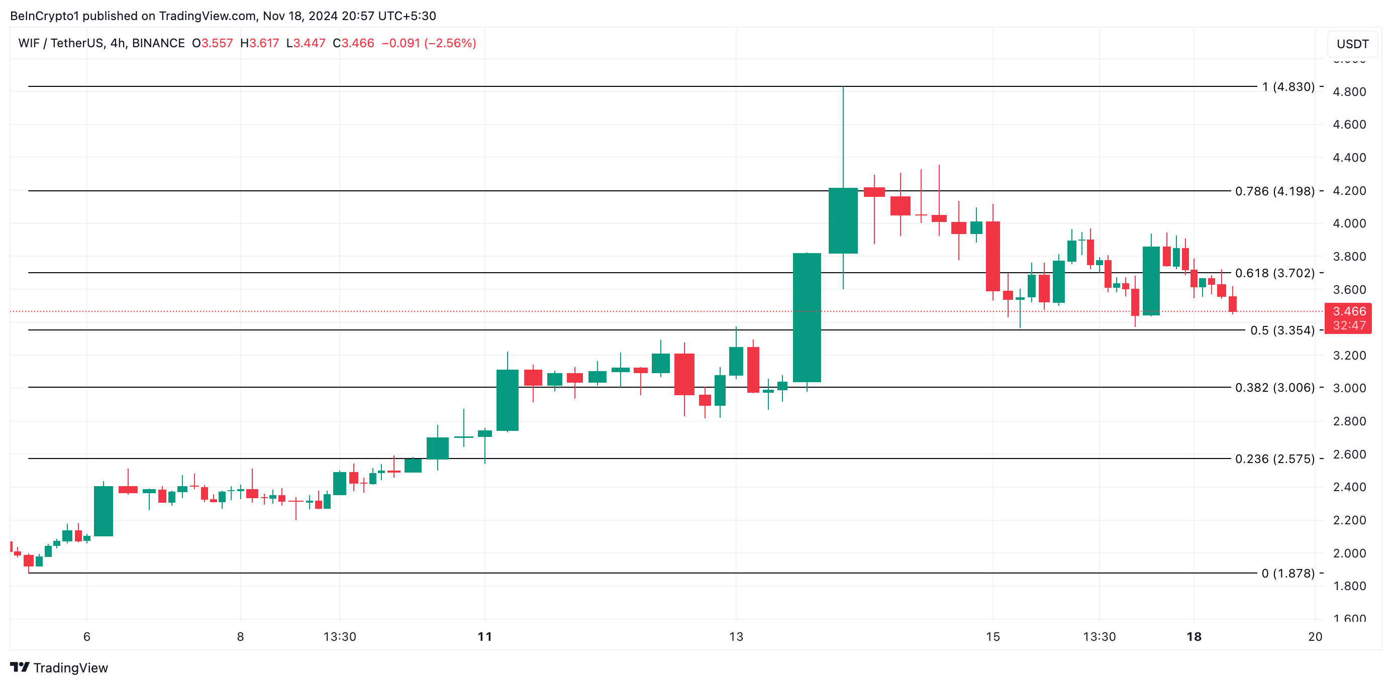 WIFは現在3.46ドルで取引されており、3.35ドルのサポートレベルをわずかに上回っている。現在の下降トレンドが続く場合、このミームコインはこのサポートをテストする可能性がある。3.35ドルでのブレイクスルーが発生すると、さらに3ドルまで下落し、売り圧力が強まると2.57ドルまで下落する可能性がある。