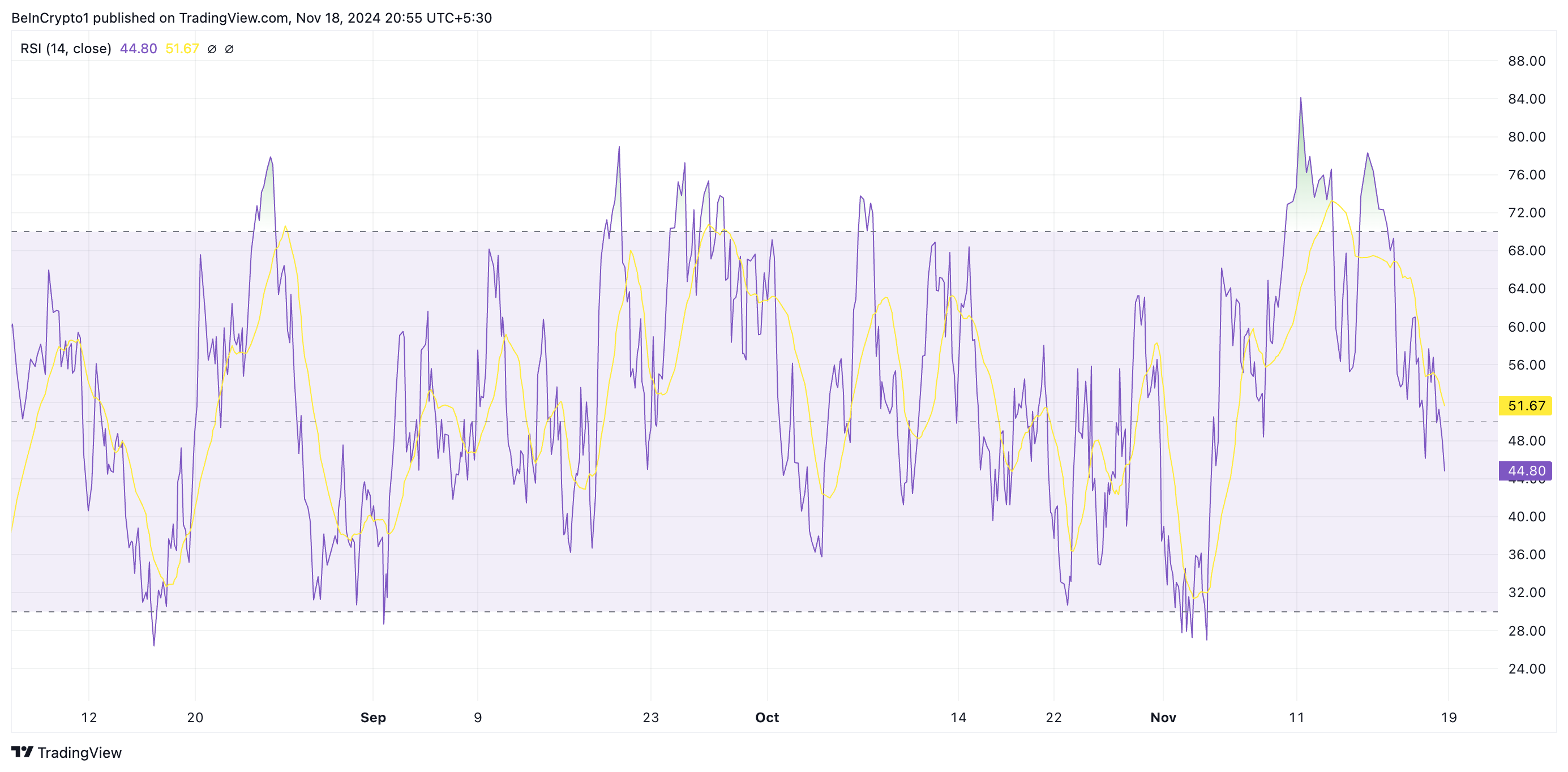 さらに、WIFの相対強度指数(RSI)は買い圧力の減少を示している。RSIは買われ過ぎと売られ過ぎの状態を測定し、0から100の範囲である。70以上の読み取りは資産が買われ過ぎであり、修正が発生する可能性があることを示し、30以下は売られ過ぎであり、反発が見られる可能性があることを示す。