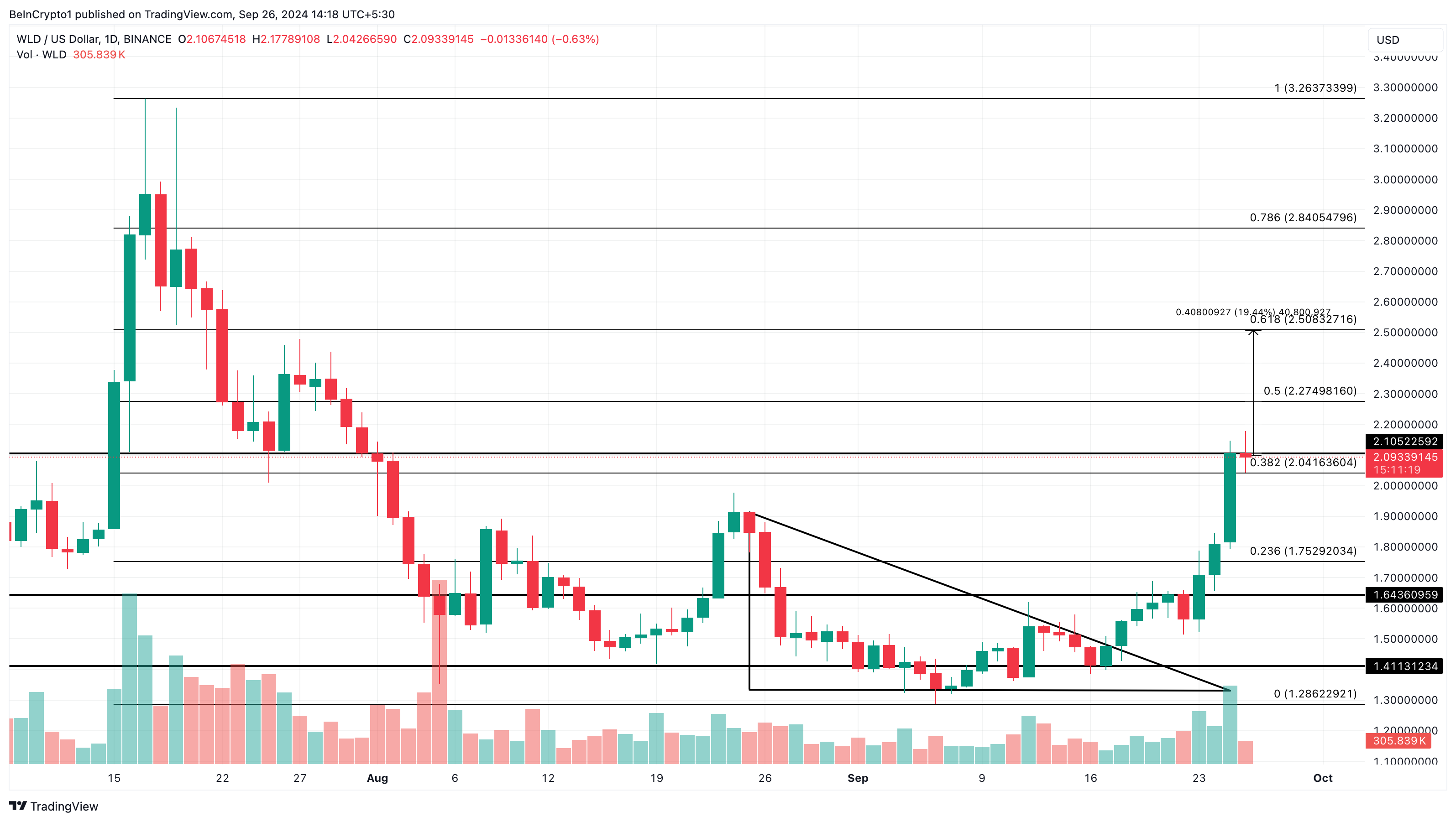 通常、これは売り手が市場を支配し、下降トレンドが続く可能性が高いことを意味します。しかし、日足のWLD/USDチャートは、アルトコインが1.41ドルでサポートを持ち、パターンから抜け出し、弱気の見通しを無効にしたことを示しています。