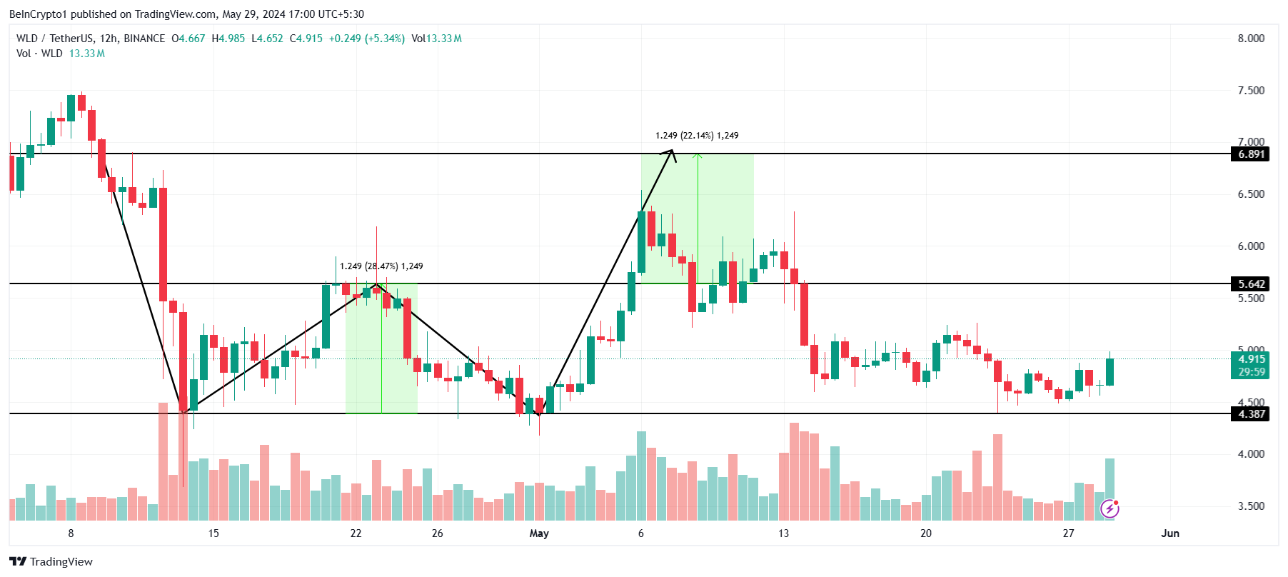 Worldcoinの価格は、過去24時間で5%の伸びを示した後、現在4.91ドルとなっている。このアルトコインは、4月に失敗したダブルボトムの強気パターンを目撃し、5月中旬から統合されている。