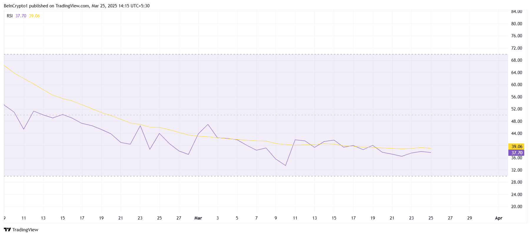 オニキスコインの相対力指数(RSI)は中立の50.0を下回っており、市場の勢いが依然として弱気であることを示している。この中立ゾーンを突破できないことは、より広範な市場からの支持が欠如していることを示している。RSIが上昇トレンドを示すまで、オニキスコインが大幅な価格回復を経験する可能性は低い。