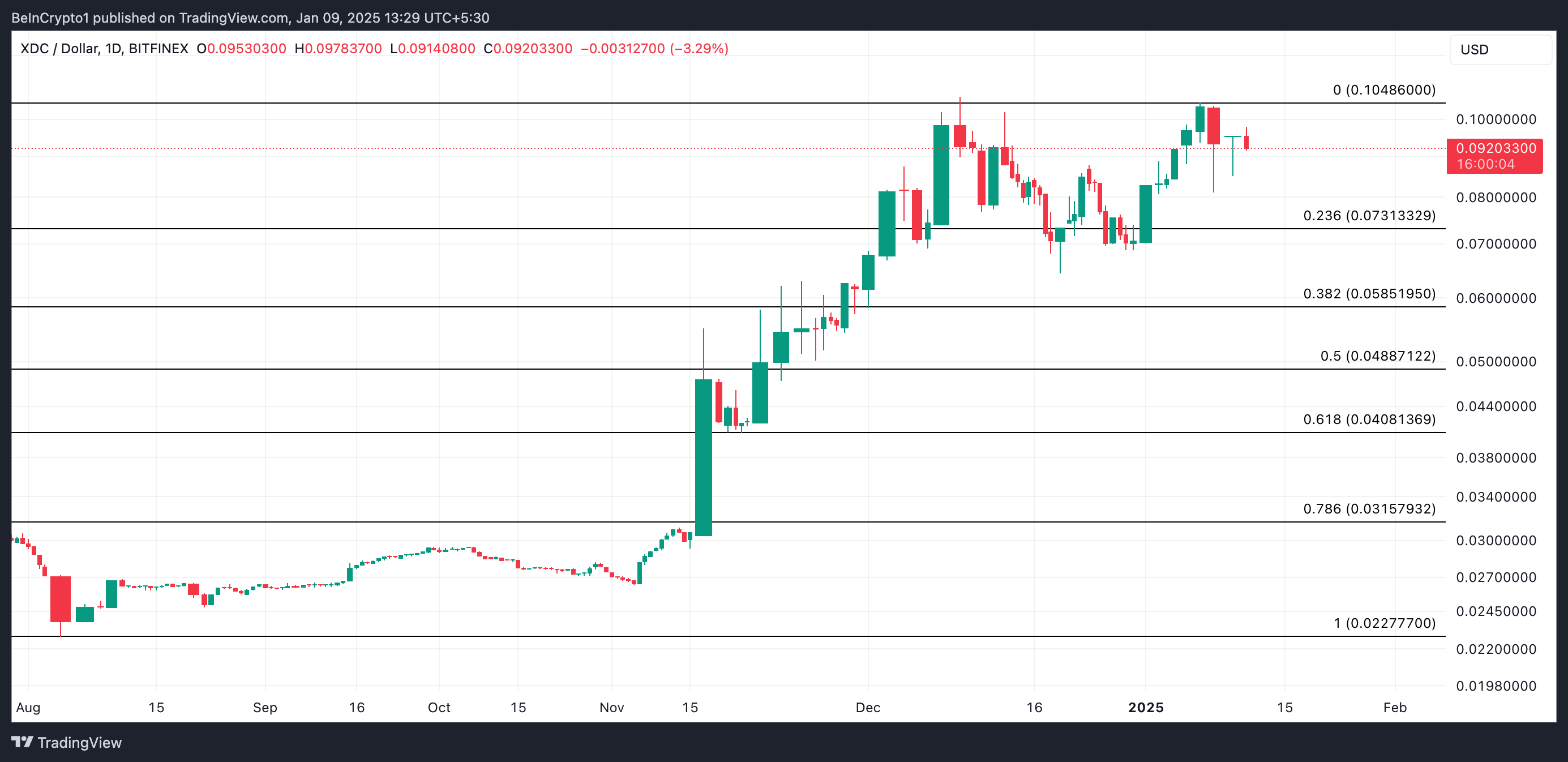 上昇傾向が続く場合、XDCのショートセラーはスクイーズに直面する可能性があります。その場合、価格は0.10ドルに達し、一部のショートポジションの清算を引き起こす可能性があります。