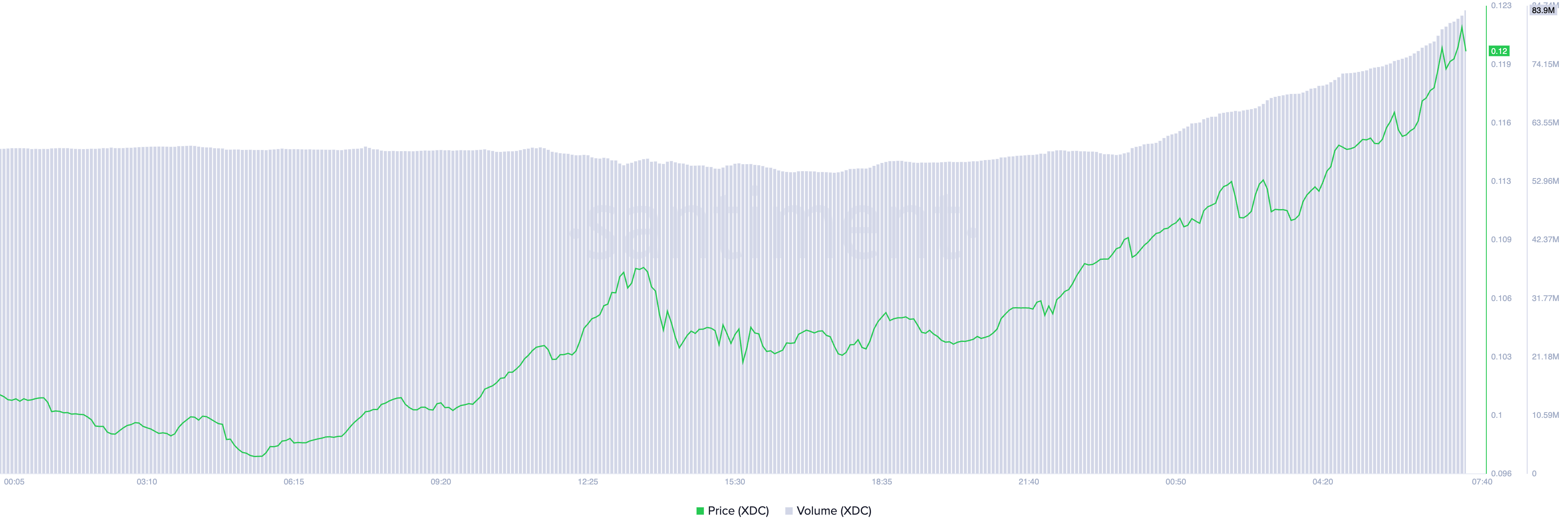 日々の取引量の急増がXDCの価格上昇に伴っています。過去24時間で40%増加し、本稿執筆時点で8400万ドルに達しています。