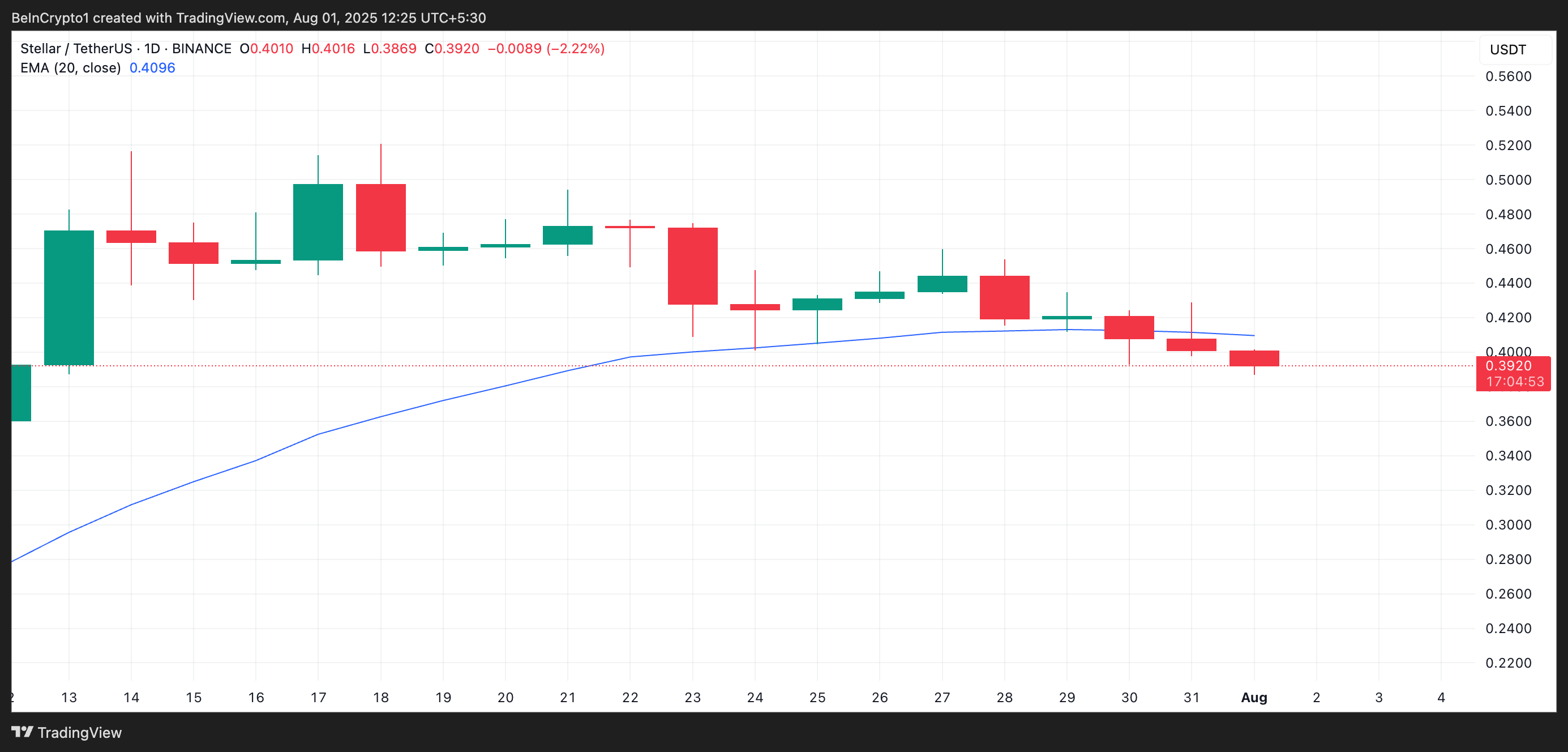 XLM/USDの日足チャートを確認すると、このアルトコインの価格は現在、20日EMA(指数平滑移動平均線)の下で推移している。20日EMAは約0.40ドル付近で動的な抵抗線として機能している。