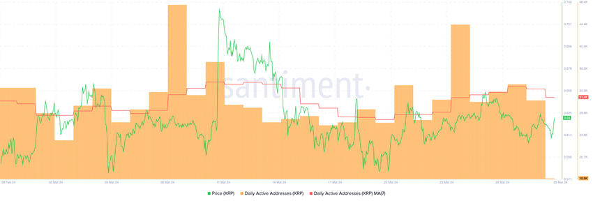 この上昇の後、デイリーアクティブアドレスは停滞した。これはXRPの価格が調整期に入り、3月15日までに0.61ドルに落ち着いたことを反映している。