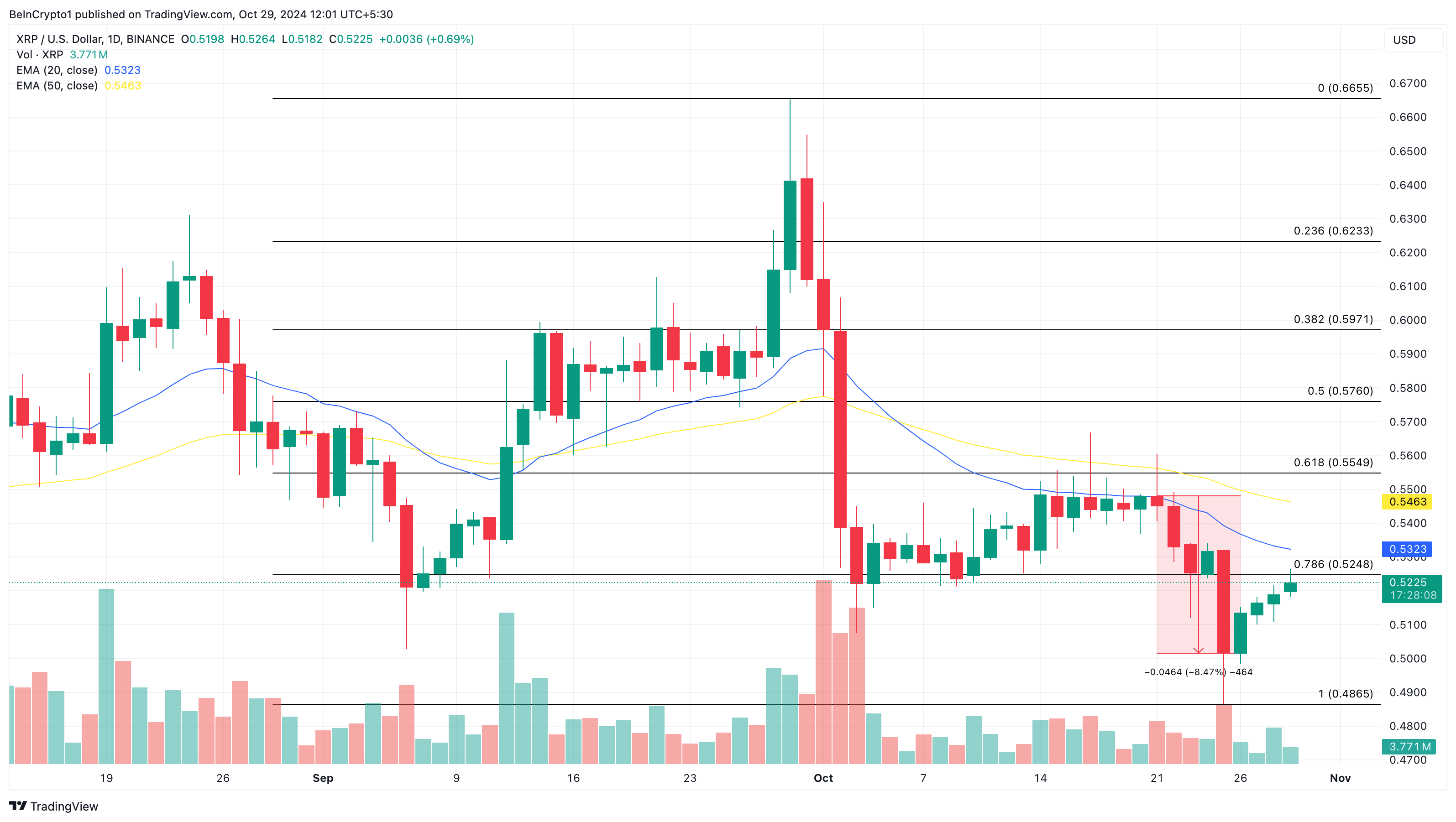 日足チャートでは、XRPの価格は10月21日に20日指数移動平均(EMA)を下回り、短期的に弱気のセンチメントへのシフトを示した。EMAは資産のトレンドを測定する技術指標である。