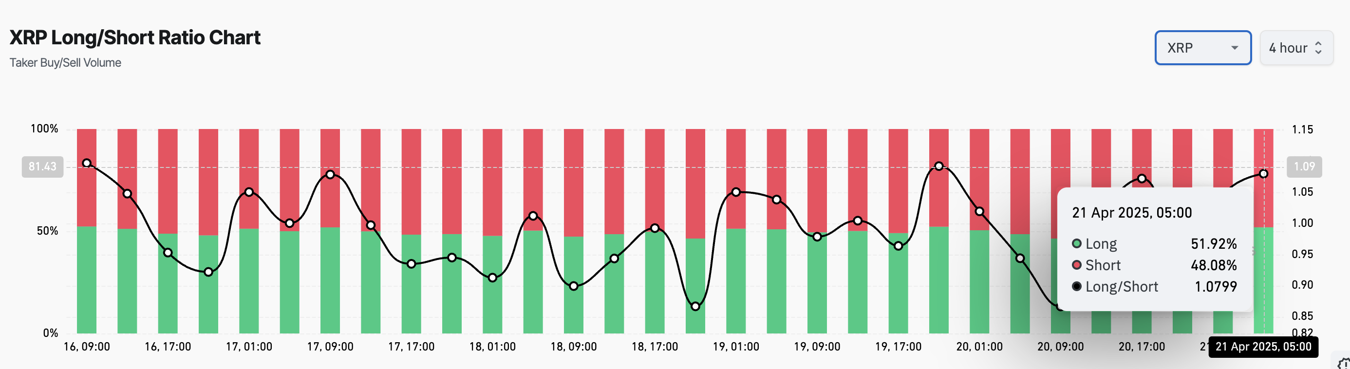 XRPのように、資産のロング/ショート比率が1を超える場合、ロングポジションがショートポジションを上回っていることを意味する。これは、トレーダーがXRPに対して主に強気であり、狭いレンジを上方突破する可能性が高いことを示唆する。