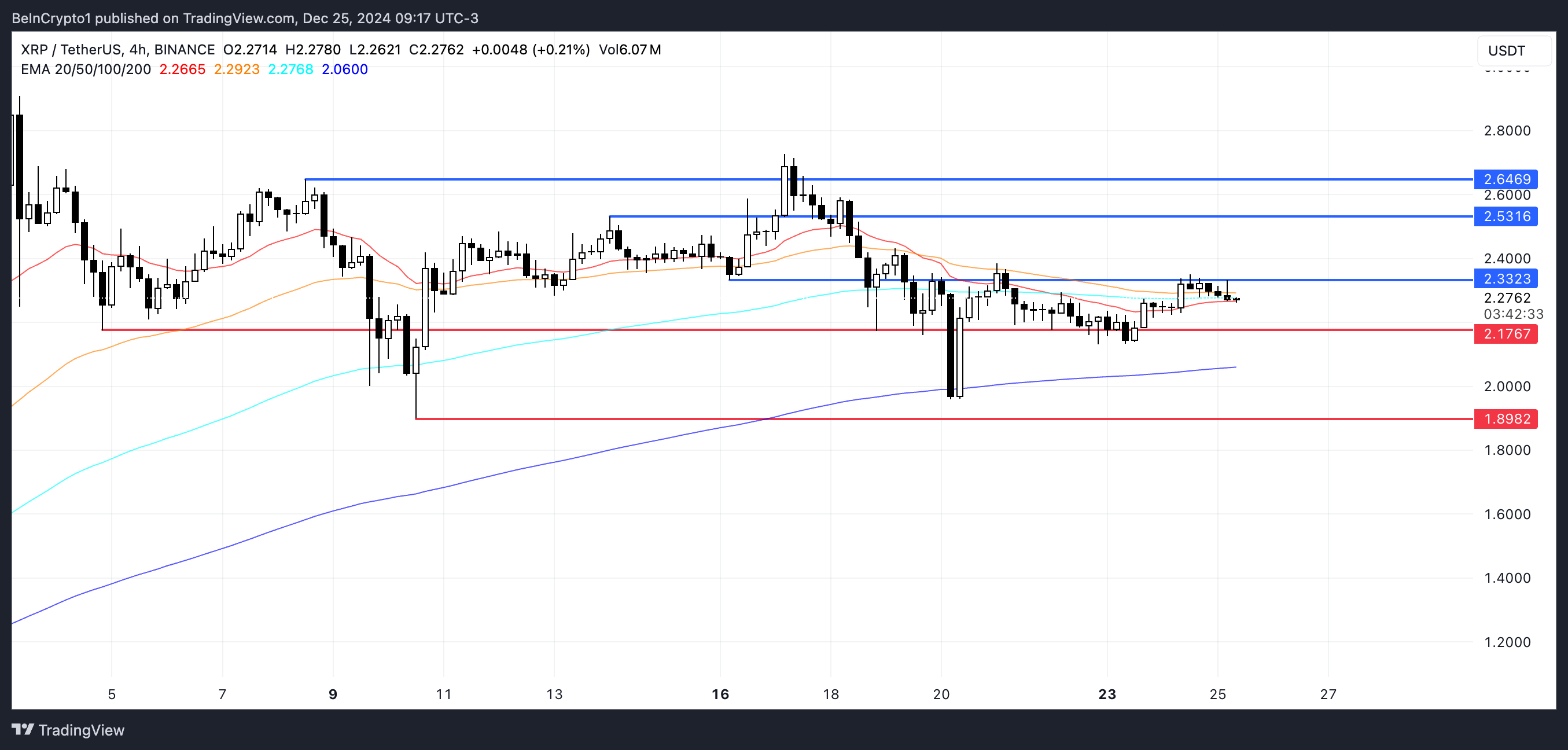 XRPの価格は現在、狭い範囲で取引されており、抵抗線は2.33ドル、支持線は2.17ドルでその即時の境界を定義している。