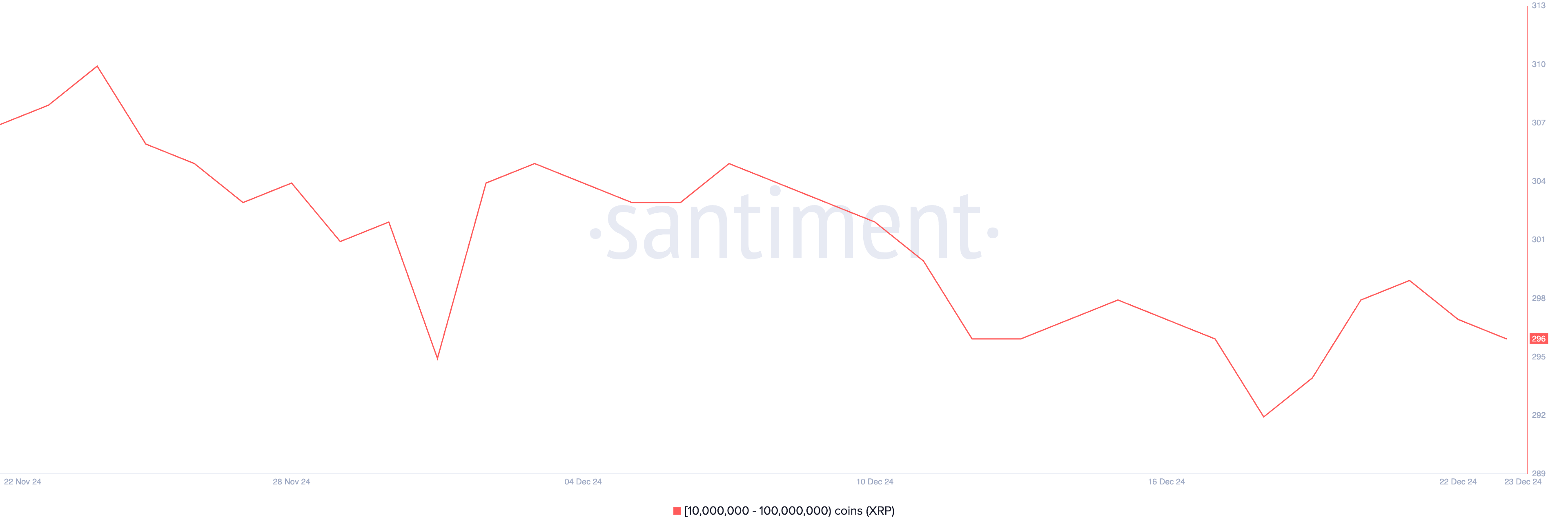 11月24日、XRPのクジラアドレスは、1,000万から1億XRPを保有するアドレスが月間最高の310に達し、大口保有者の間での重要な蓄積を示している。それ以来、クジラアドレスの数は徐々に減少しており、大規模な関心の減少または分配活動の可能性を反映している。