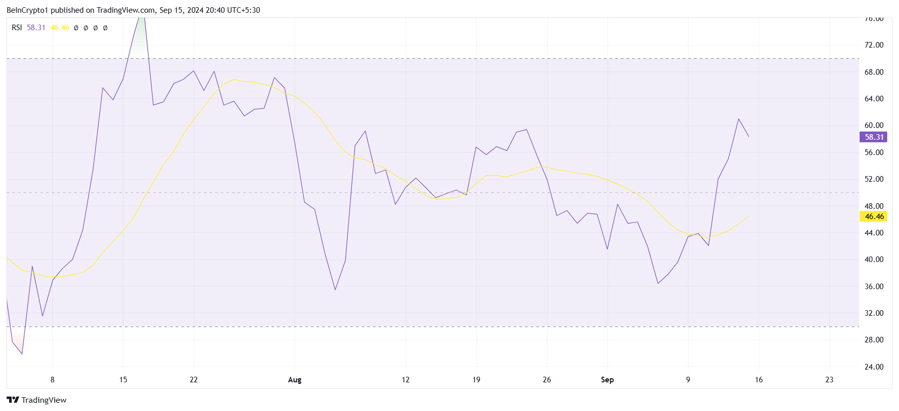 広く使用されているモメンタム指標である相対力指数(RSI)は、XRP価格の強い強気のモメンタムを示しています。現在、RSIは1ヶ月半の高値に位置しており、暗号通貨が上昇を続けるのに十分な強さを持っていることを示唆しています。RSIが高いほど、多くの場合、買い圧力が高まっていることを示しています。