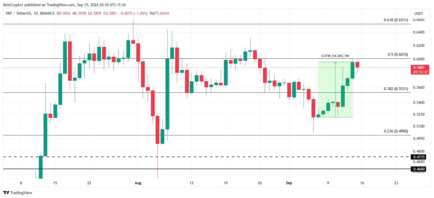 XRP価格の最近の14%の上昇により、暗号通貨は0.58ドルになり、重要な0.60ドルのマークにわずかに届かないレベルになりました。また、アルトコインはフィボナッチ・リトレースメントの50%ラインに近づいており、これはこの価格帯と一致しています。