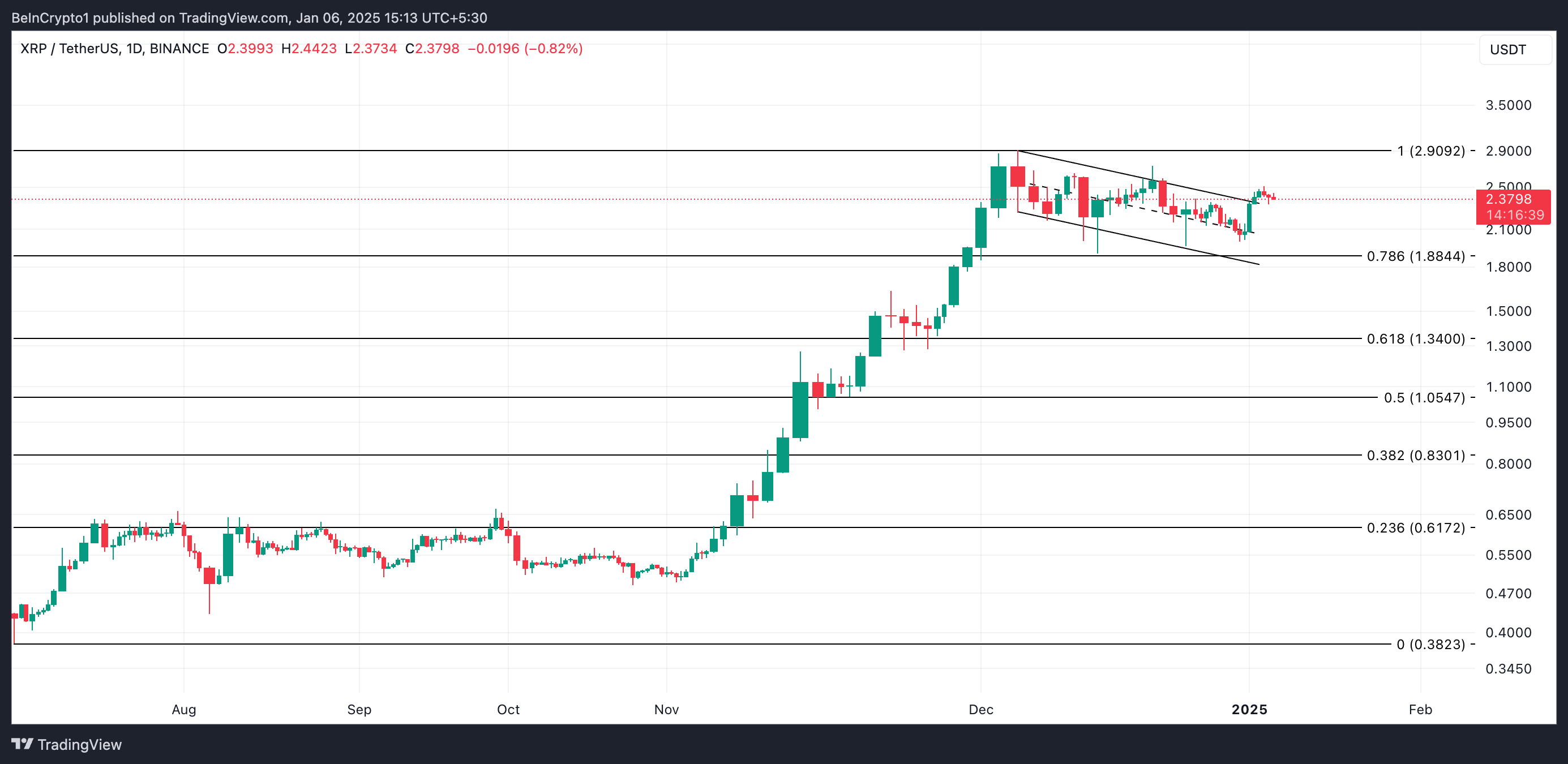 記事執筆時点で、XRPは2.37ドルで取引されています。過去1週間の16%の上昇により、下降する平行チャネルの上限を超えました。
