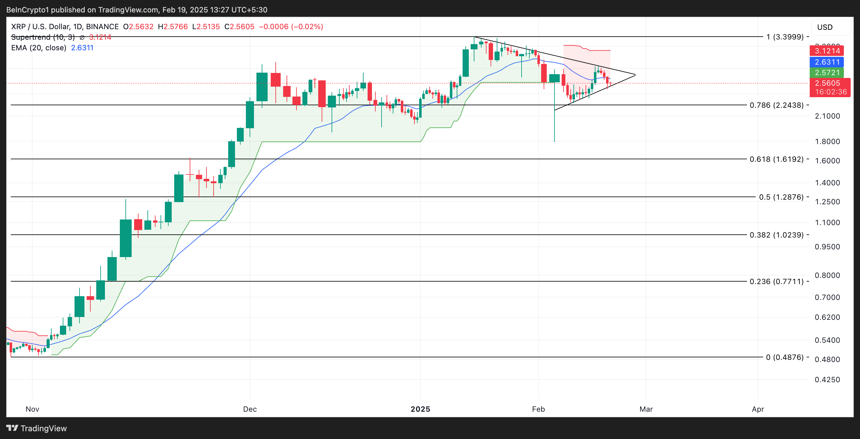 XRP/USDの日足チャートを評価すると、同コインは1月16日に過去最高値(ATH)3.39ドルに達して以来、対称三角形パターン内で取引されている。このパターンは、資産の価格が収束する2つのトレンドライン内で取引されるときに形成され、統合とボラティリティの低下を示す。