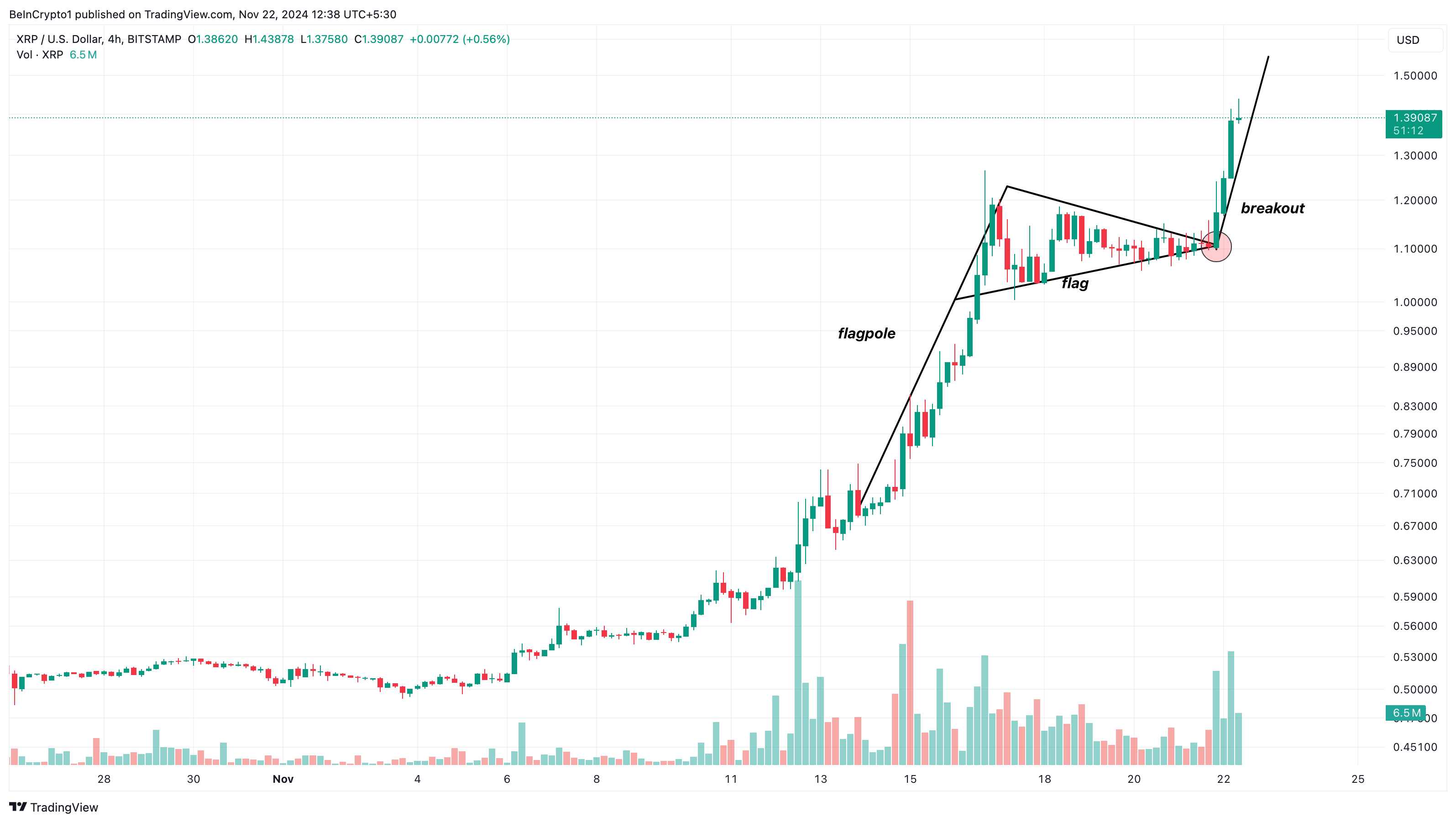 4時間チャートによると、XRPは11月18日以来、1.04ドルから1.17ドルの範囲で取引されている。この横ばいの動きは、上昇の勢いを示す強気のチャートパターンであるブルフラッグの形成をもたらした。