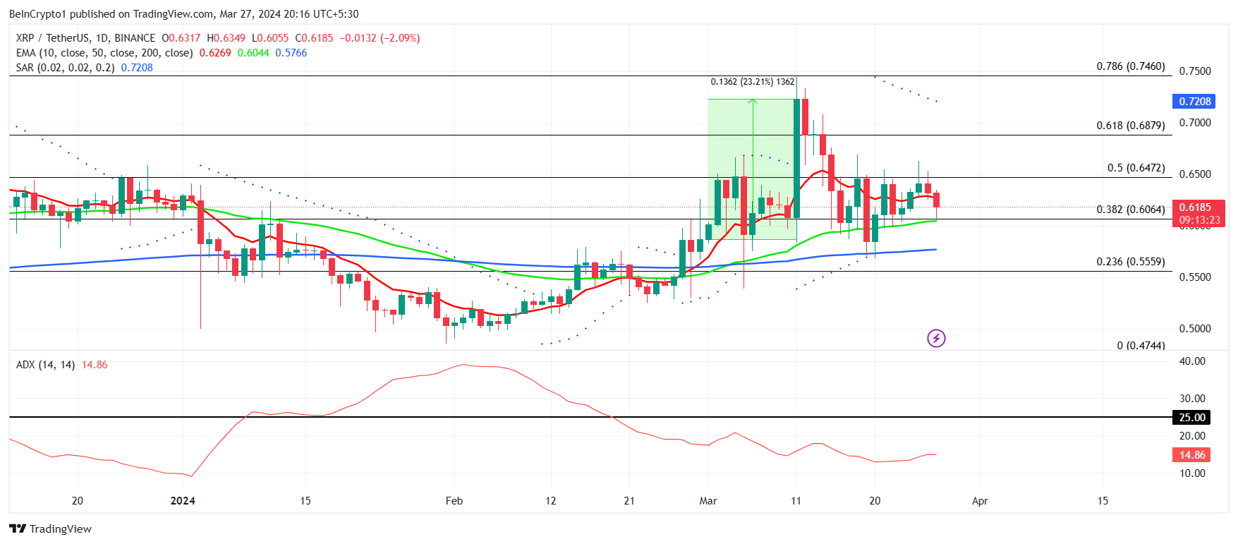 XRP価格は現在、0.606ドルのサポートレベルの上で取引されている。このアルトコインはすでに50日指数移動平均(EMA)を下回っている。0.606ドルのサポートも無効になれば、暗号通貨は100日EMAをサポートとして失うことになる。