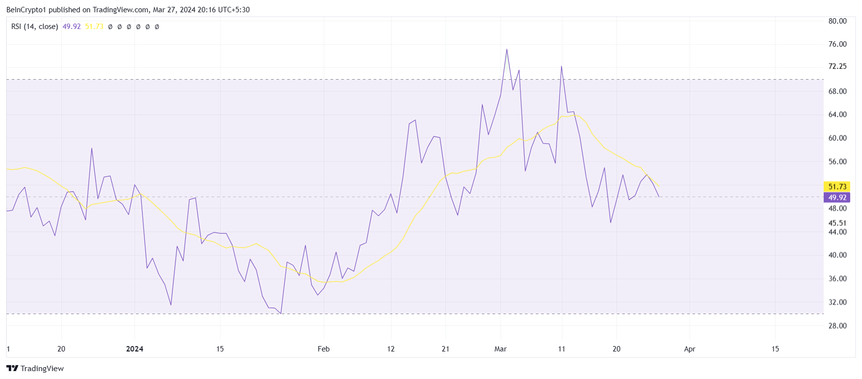 相対力指数(RSI)が中立ラインの50.0を下回れば、弱気の動きが確定する。RSIは値動きの速さと変化を測定するモメンタムオシレーターで、買われ過ぎと売られ過ぎの状態を示す。