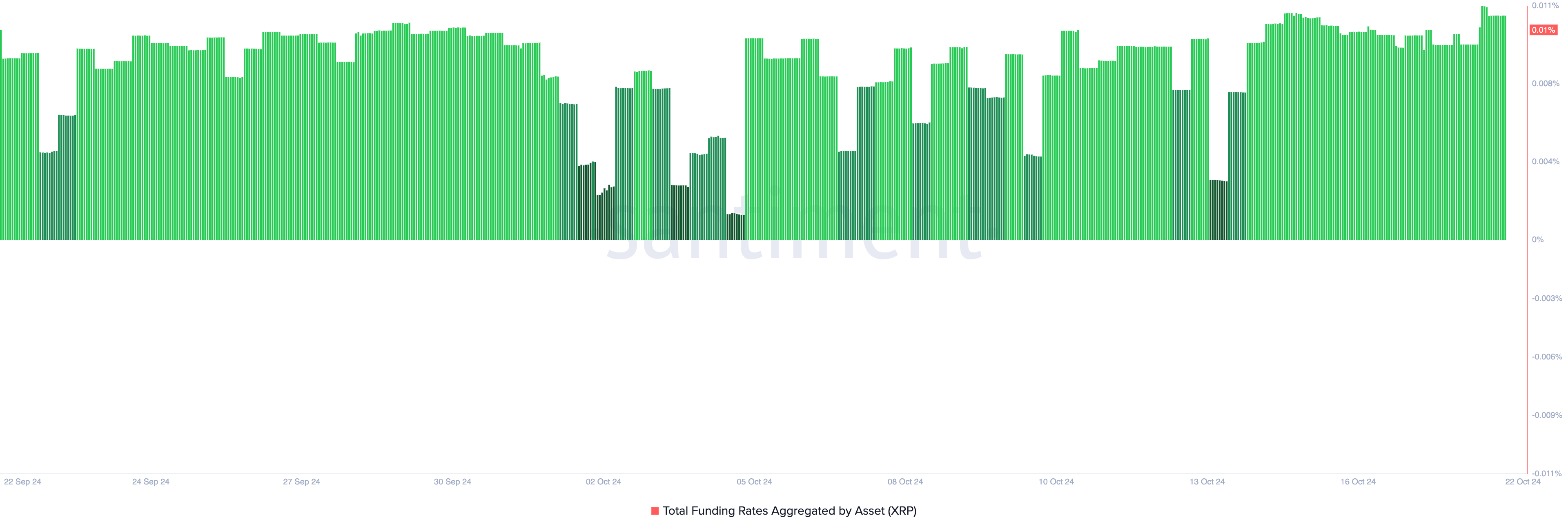 XRPのポジティブなファンディングレートは、現在の時点で0.01%であり、価値の低下にもかかわらず、アルトコインが強気のバイアスを享受していることを反映している。
