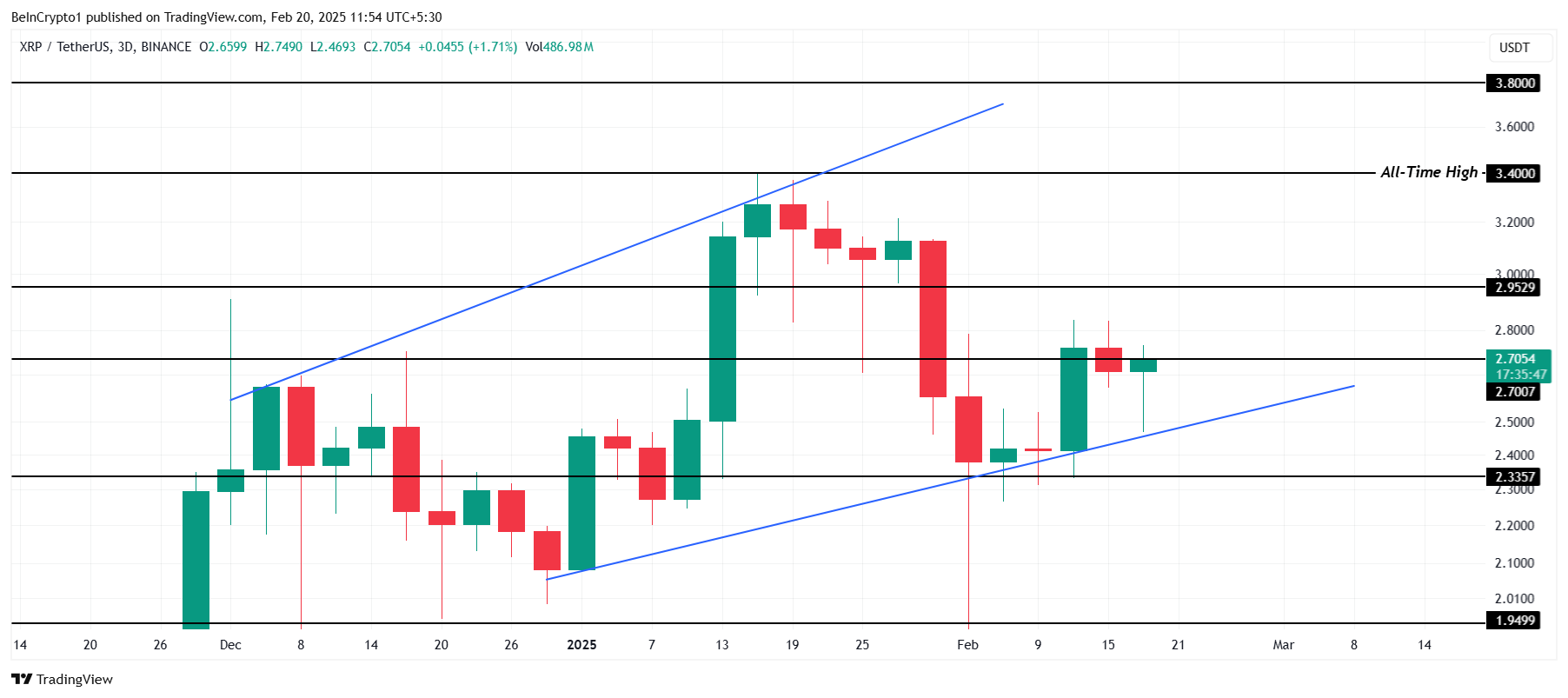 しかし、XRPが2.7ドルをサポートとして突破し維持できない場合、次のサポートレベルである2.33ドルに向けて急落する可能性がある。これにより、現在の上昇パターンと見通しが無効となり、回復が遅れるか逆転する可能性がある。