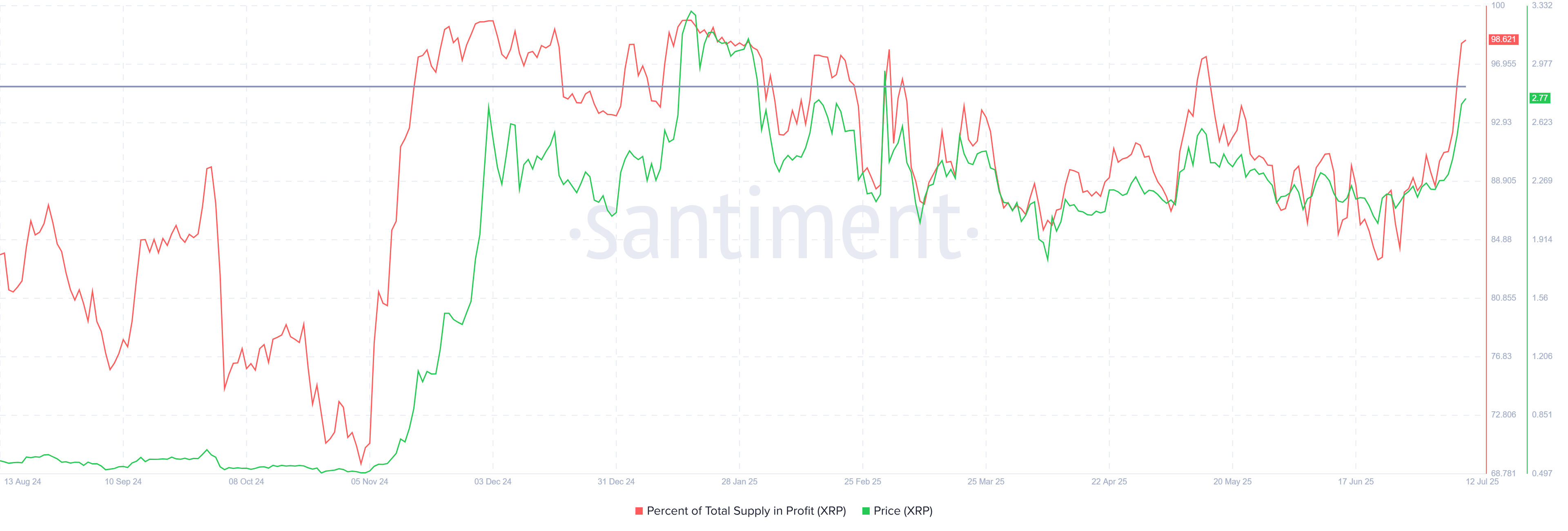 XRPの利益供給は最近95%の閾値を超えた。これは市場のピークを示す重要なレベルであり、供給がこのレベルを超えると通常、価格の反転が起こる。