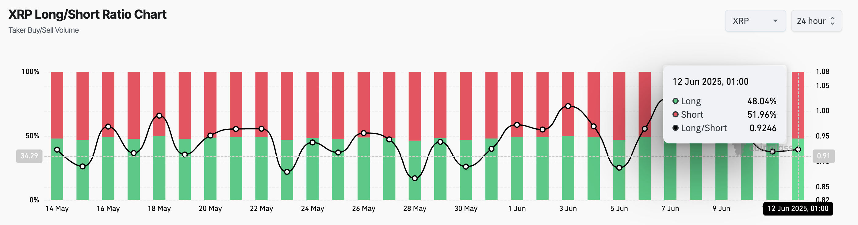 ロング/ショート比率は、市場における強気(ロング)ポジションと弱気(ショート)ポジションの割合を測定する。XRPのように比率が1を下回る場合、価格の下落を予想するトレーダーが価格の上昇を予想するトレーダーより多い。
