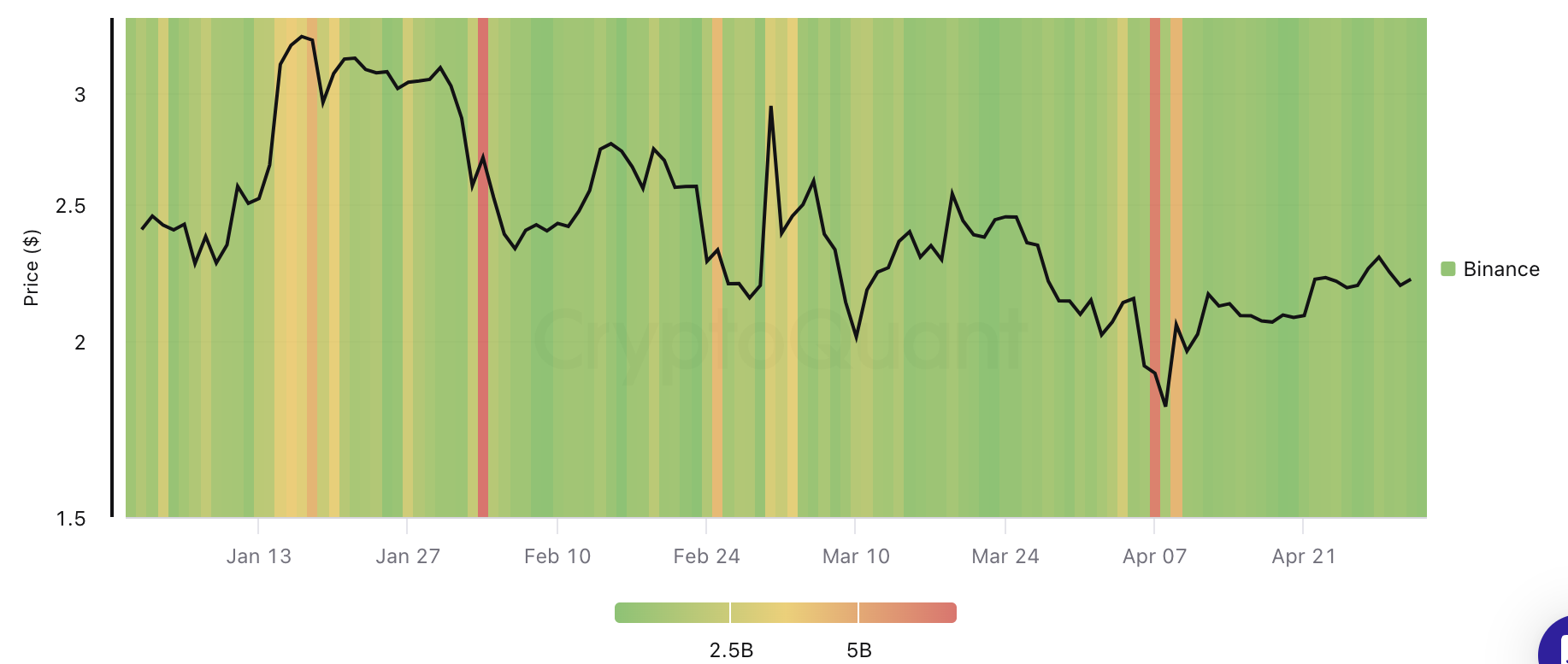 “バイナンスへのXRPクジラの預金は、XRPの価格の転換点を示す傾向がある。例えば、4月7日から9日にかけて、XRPの流入が12億から69億に急増した際、XRPの価格は底を打った。同様に、3月初めにXRPの価格は局所的な高値を見つけ、クジラの預金が7億から29億XRPに増加した”とCryptoQuantのリサーチ責任者であるフリオ・モレノ氏は述べた。