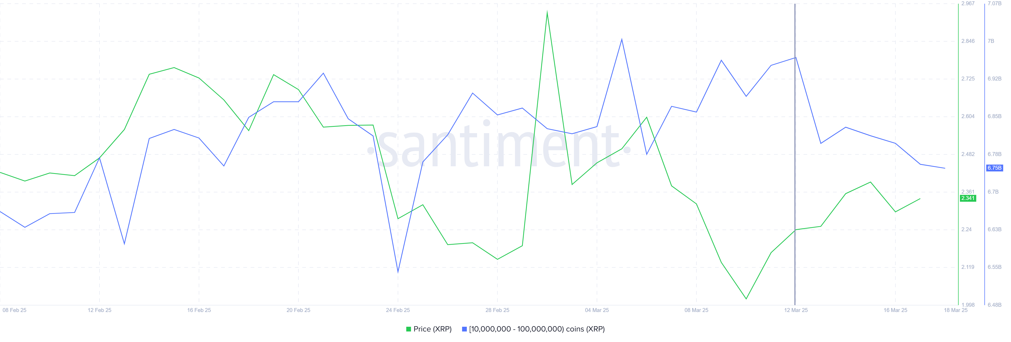 クジラ、つまり大口のXRP保有者は、最近の価格上昇にもかかわらず弱気の兆候を示している。最近のデータによれば、1000万から1億XRPを保有するアドレスが過去6日間で2億2000万XRP以上を売却し、約5000億ドル相当だ。