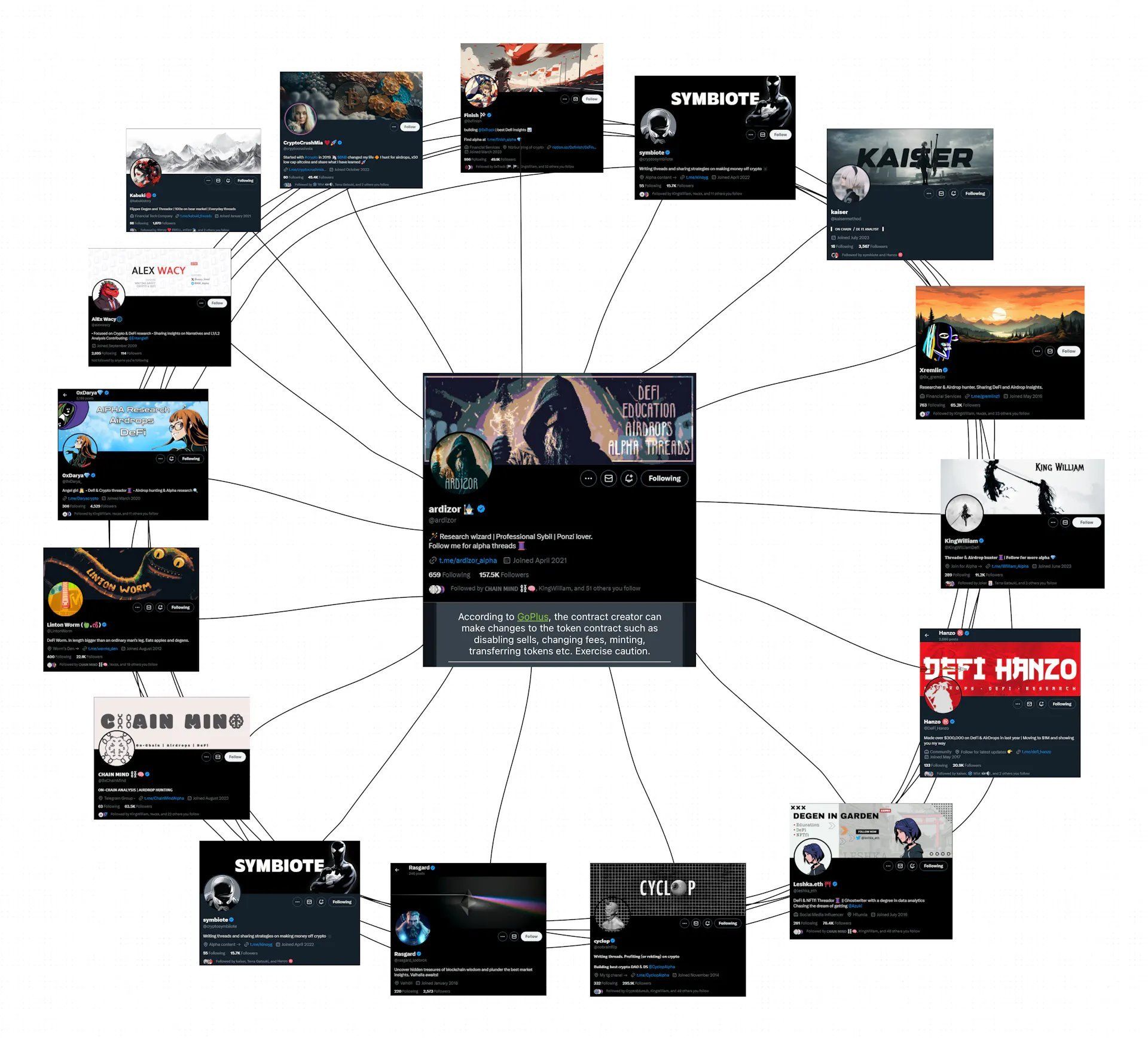 ZachXBTは、Xアカウント「ardizor」が他の16のアカウントと関連していると報告しました。これらのアカウントのほとんどは青い認証チェックマークを表示しており、数万人から数十万人のフォロワーを持っています。