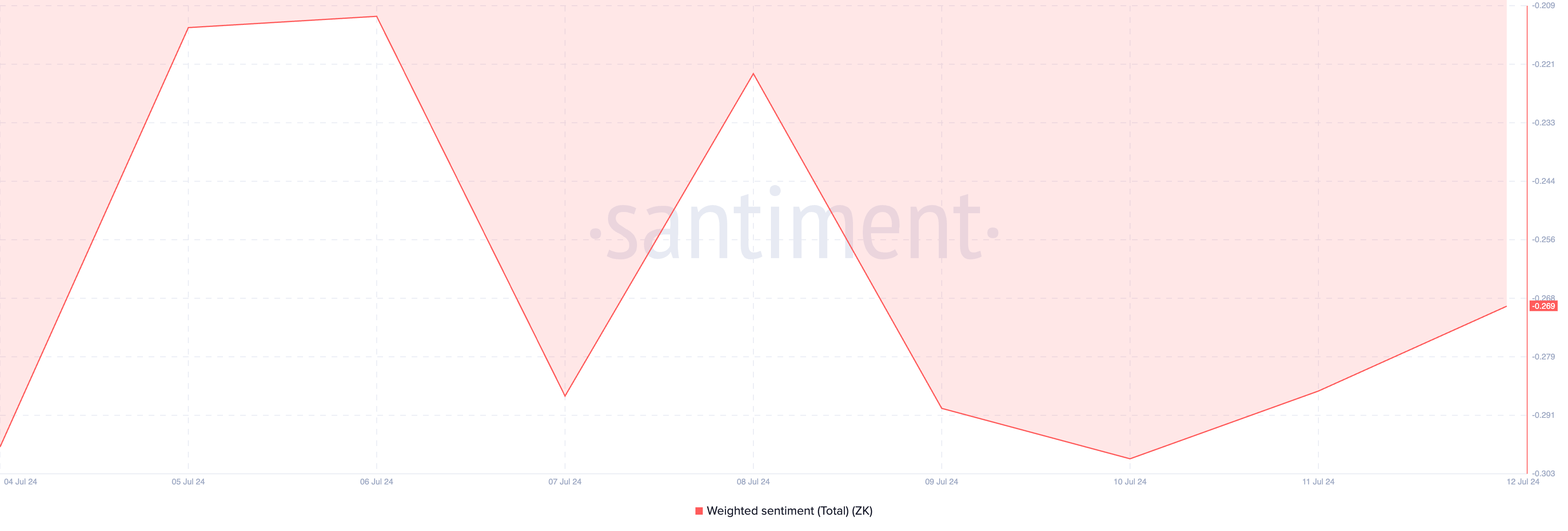 さらに、否定的なセンチメントがZKを追い続けている。過去14日間に33%の値上がりにもかかわらず、市場参加者は慎重な姿勢を崩していない。これは、一貫してネガティブなウェイトのセンチメントから読み取れる。この記事を書いている時点で、トークンの加重センチメントは-0.26です。