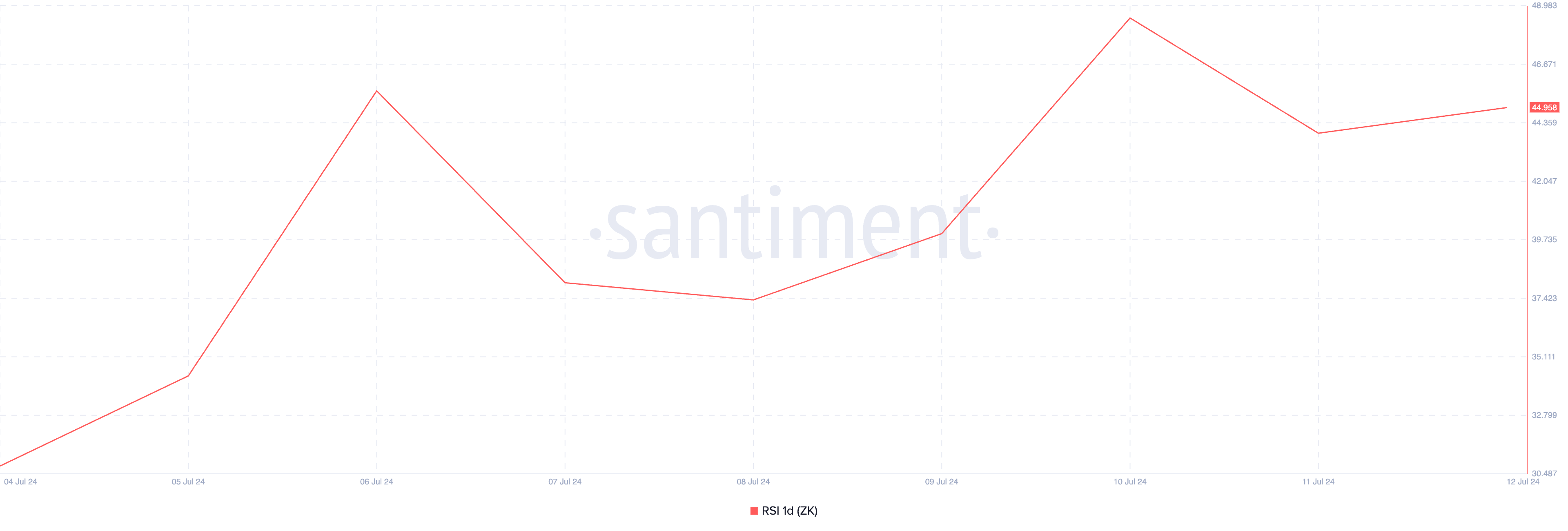 しかし、この価格高騰はL2トークンに対する実際の需要に裏打ちされたものではない。相対力指数(RSI)を評価すると、ZKの価格は上昇しているものの、オンチェーンでの需要に大きな上昇は見られない。本稿執筆時点では、トークンのRSIは50ニュートラルラインの44.95を下回っている。