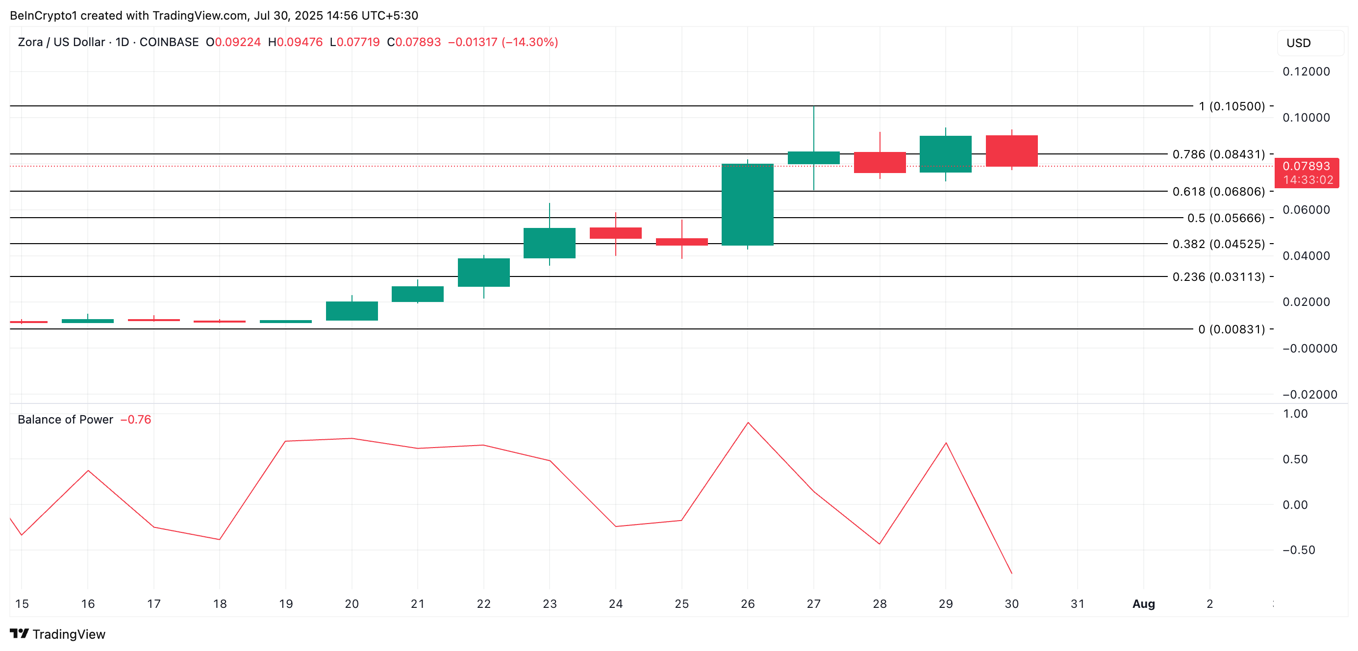 ZORAが過去最高値の0.105ドルに達した後の急な後退。市場のボラティリティが高まり、広範なアルトコイン市場に不確実性が忍び寄る中、クジラはトークンの価格が高い間にエクスポージャーを削減しているようだ。